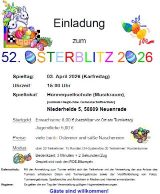 Read MoreNeuenrade, 01. Januar 2026. Das diesjährige Neujahrsblitzturnier der Schachfreunde Neuenrade am 01.01. mit 20 Teilnehmern war nicht so gut besucht wie in den beiden letzten Jahren, als jeweils 30 Spieler anreisten. So wurde nicht das Schweizer System mit 15 sondern ein Rundenturnier mit 19 Durchgängen „jeder gegen jeden“ durchgeführt. Auf alle Teilnehmer warteten jahreszeitlich angepasste Preise.