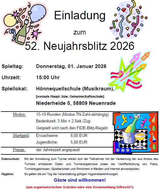 Neuenrade, 06. November 2025. Ausnahmsweise am Donnerstag fand die von den Schachfreunden Neuenrade ausgetragene Stadtblitzmeisterschaft 2025 statt. Leider beteiligten sich nur acht Spieler an der Meisterschaft. Favoriten waren Rainer Bialas mit acht Siegen, Vasileios Lanaras, der siebenmal erfolgreich war, Walter Cordes mit sechs Titeln sowie Frank Wichmann und Rolf Schulte mit jeweils zweimaliger Meisterschaft. Es wurde zwei Runden „jeder gegen jeden“ gespielt.
